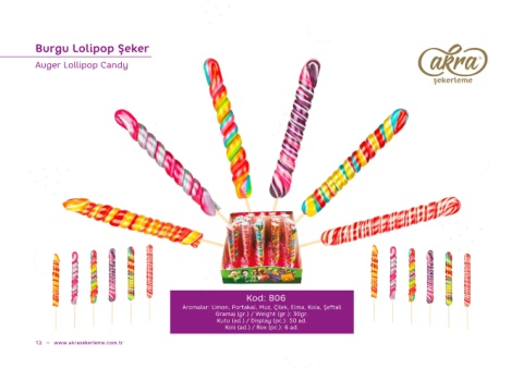 Burgu Lolipop Şeker Auger Lollipop Candy Kod: B06 Aromalar: Limon, Portakal, Muz, Çilek, Elma, Kola, Şeftali Gramaj (gr.) / Weight (gr.): 30gr. Kutu (ad.) / Display (pc.): 50 ad. Koli (ad.) / Box (pc.): 6 ad. 12 ~ www.akrasekerleme.com.tr